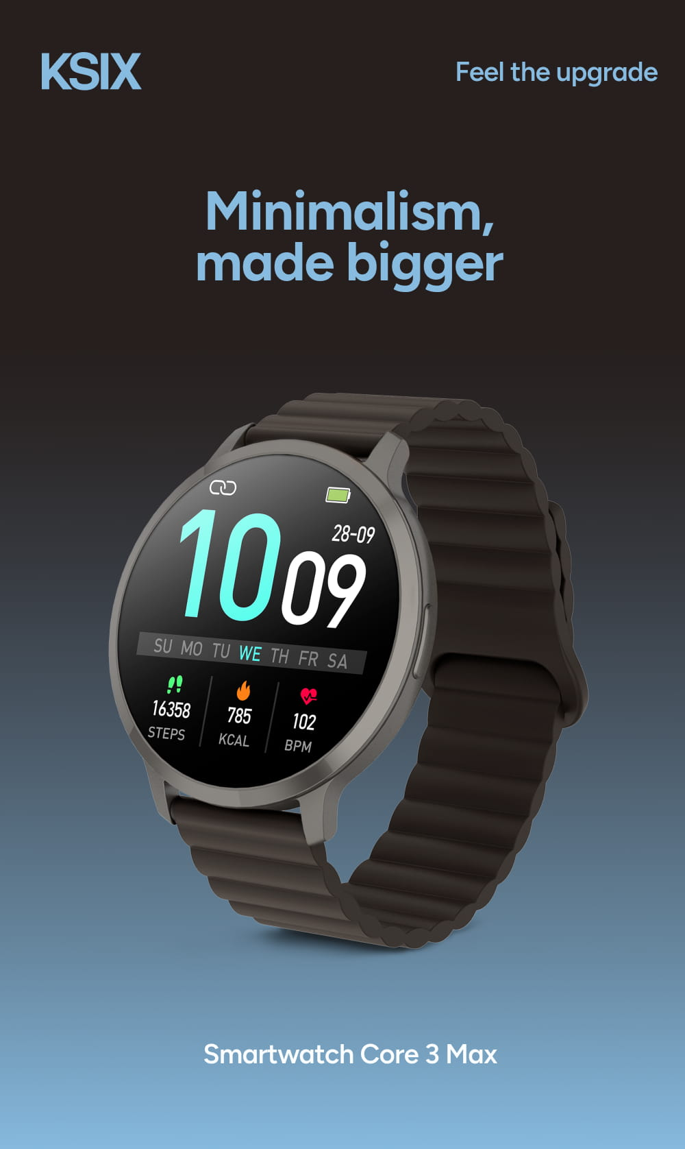 KSIX Core 3 Max přichází v inovované verzi, která je mimořádně tenká a zároveň nabízí větší plochu displeje. Tato kombinace zajišťuje, že hodinky vypadají na zápěstí velmi elegantně a poskytují maximální přehled o všech vašich notifikacích i aktivitách.
