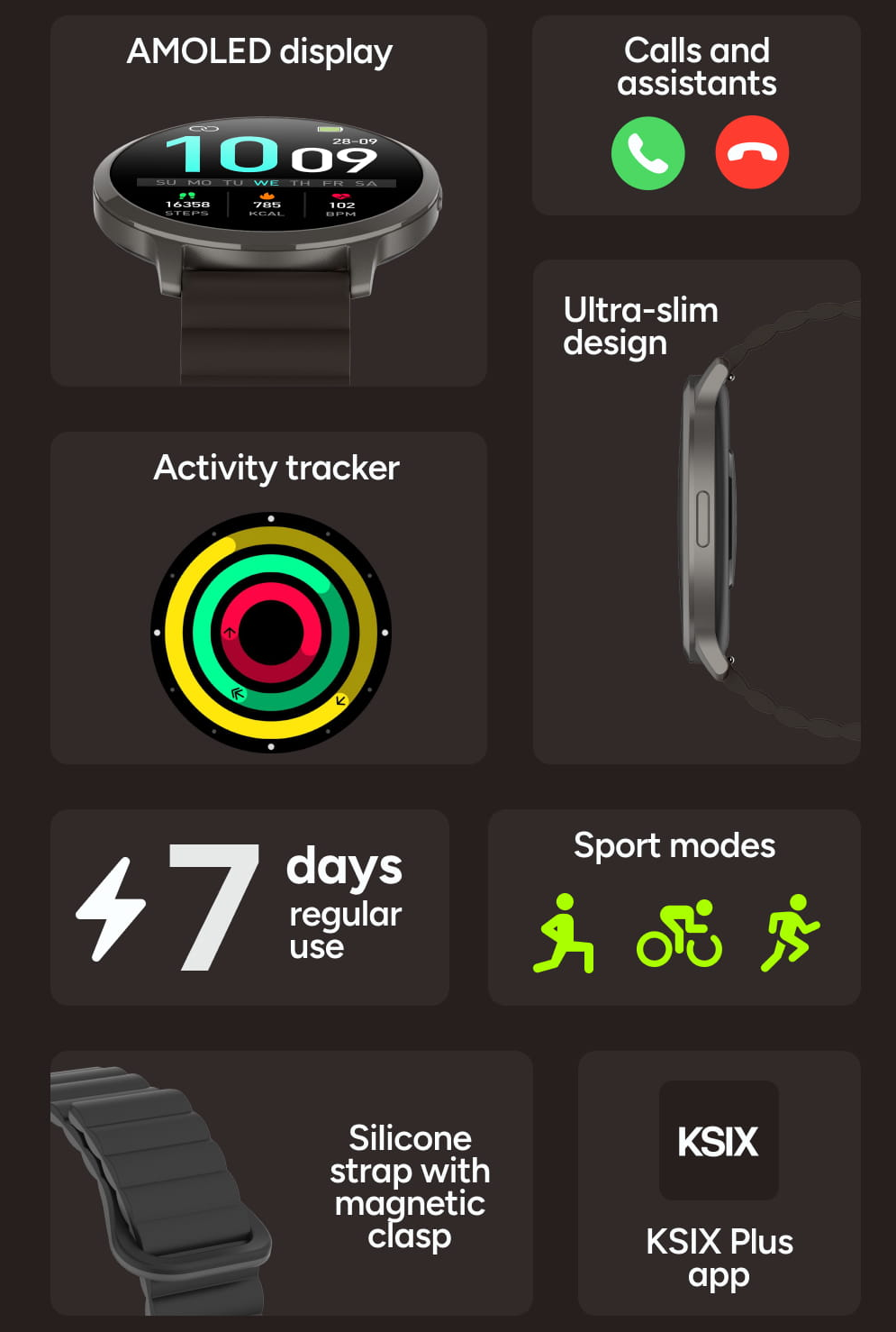 Chytré hodinky KSIX Core 3 Max - 1.73" AMOLED, 7denní výdrž baterie, IP68, tmavě hnědá, tmavě hnědý magnetický silikonový řemínek