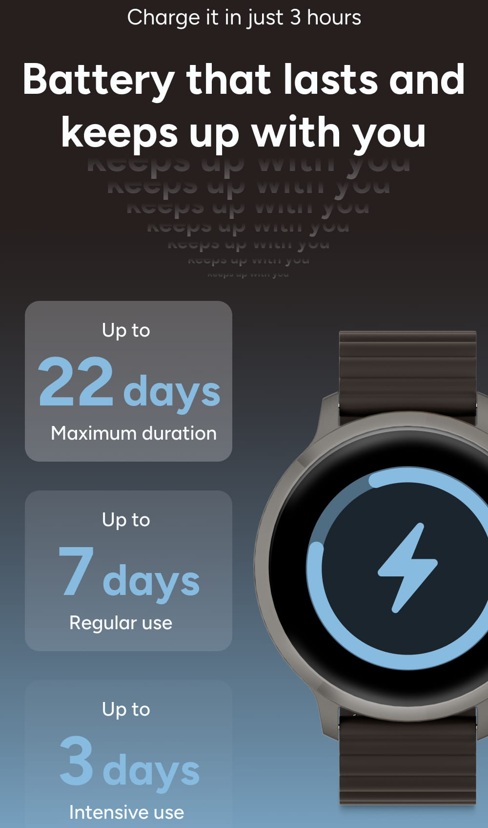 Hodinky jsou navrženy pro váš rytmus bez neustálého nabíjení. Při běžném používání vydrží až 7 dní, v úsporném režimu pak až 22 dní. I při intenzivním nasazení všech funkcí se můžete spolehnout na solidní 3 dny provozu.
