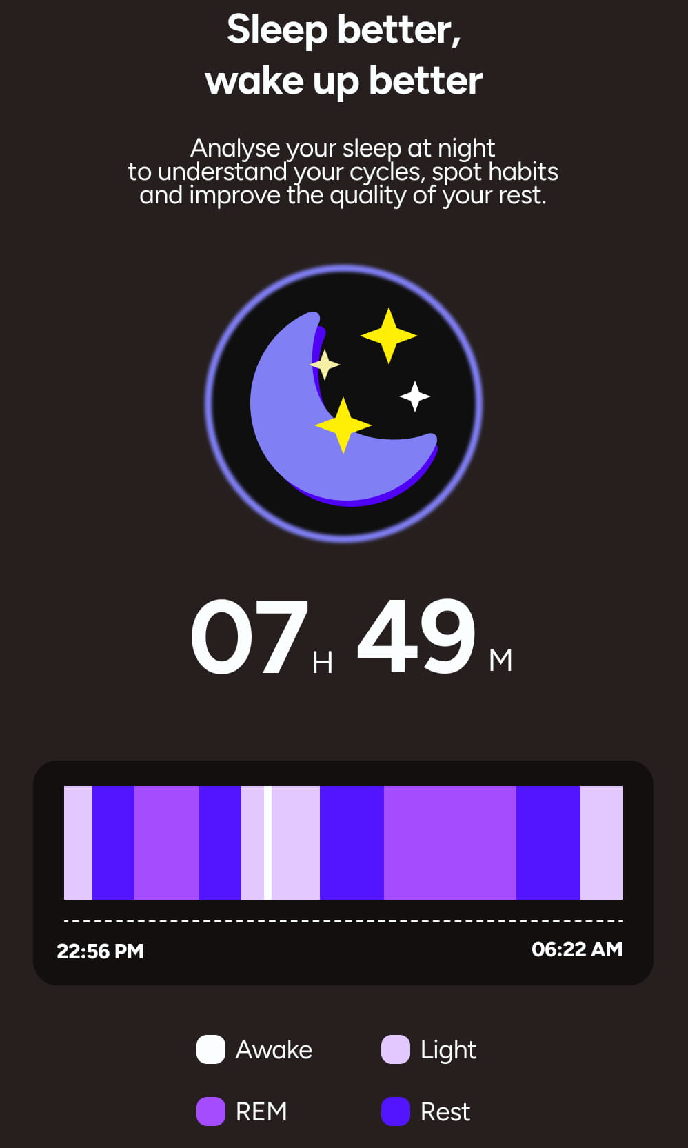 Hodinky přesně rozlišují mezi jednotlivými fázemi, jako je lehký spánek, hluboký spánek, REM fáze nebo čas, kdy jste byli vzhůru. Tento detailní rozbor v aplikaci vám umožní odhalit spánkové návyky a postupně zlepšovat kvalitu vaší regenerace.