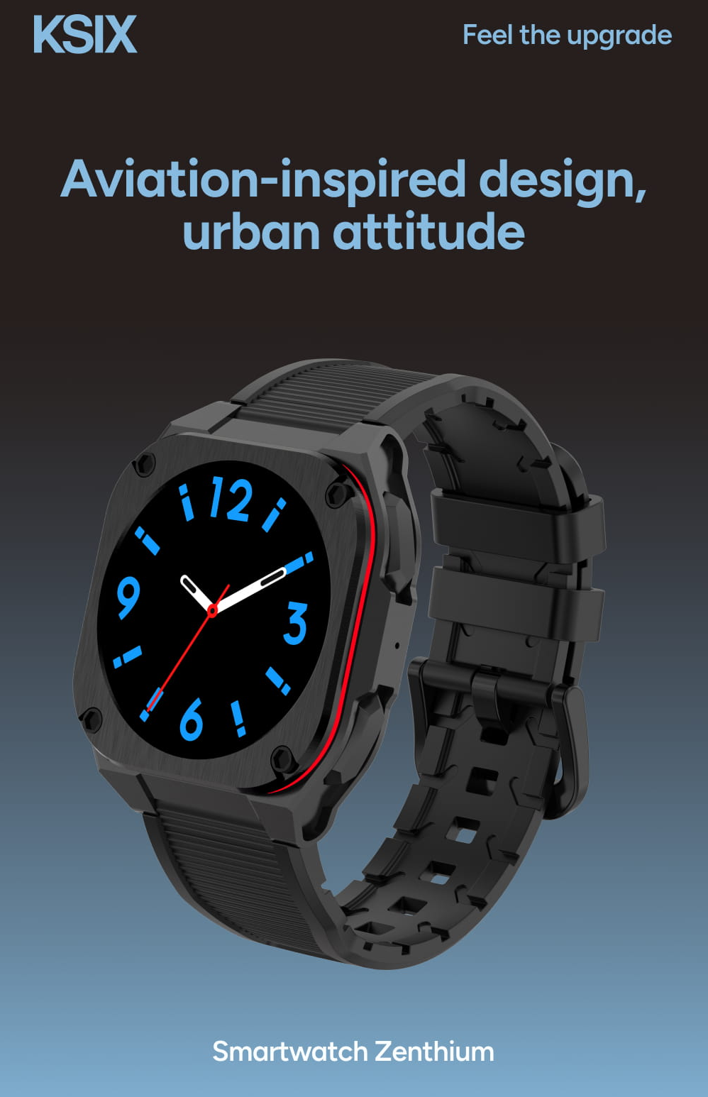 Ksix Zenthium sází na robustní konstrukci inspirovanou aerodynamikou letectví. Matně černé hliníkové tělo doplňuje dravý červený prstenec a texturovaný silikonový řemínek. Tento design zajišťuje maximální stabilitu a styl při celodenním nošení.