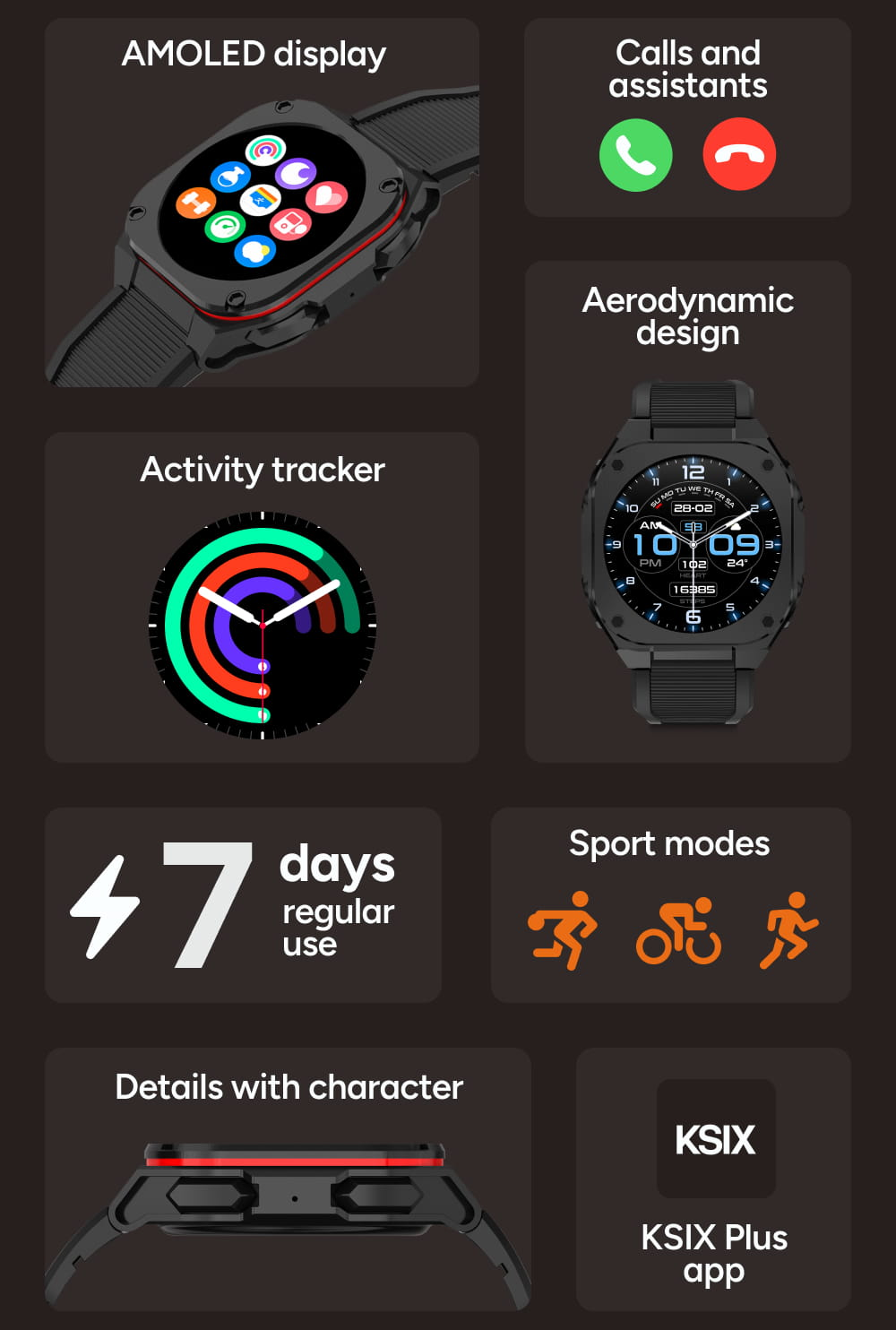 Díky preciznímu zpracování a odolnosti IP68 zvládnou jakýkoliv terén, zatímco pokročilé senzory nepřetržitě monitorují vaše zdraví, tep i sportovní výkony. Samozřejmostí je propojení s mobilní aplikací KSIX Plus, která vám poskytne detailní přehled o všech aktivitách.