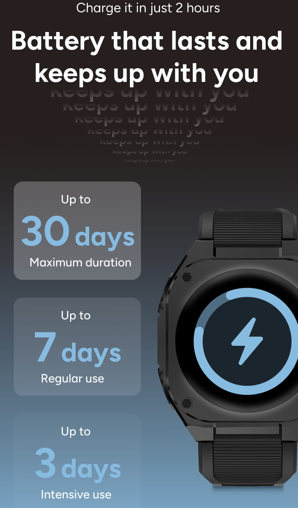 Pokud hodinky využíváte jen střídmě, v pohotovostním režimu na zápěstí vydrží neuvěřitelných 30 dní. Když už energie dojde, stačí jim pouhé 2 hodiny na nabíječce a jsou opět připraveny do akce. Je to ideální volba pro každého, kdo nechce řešit stav baterie každých pár hodin.
