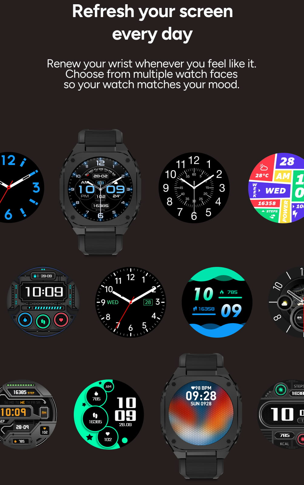 Oživte svůj displej novým vzhledem, kdykoliv budete mít chuť na změnu. Intuitivní nastavení umožňuje bleskově přepínat mezi barevnými schématy a různými typy ciferníků. Vaše hodinky tak budou vždy perfektně ladit s tím, co právě děláte.