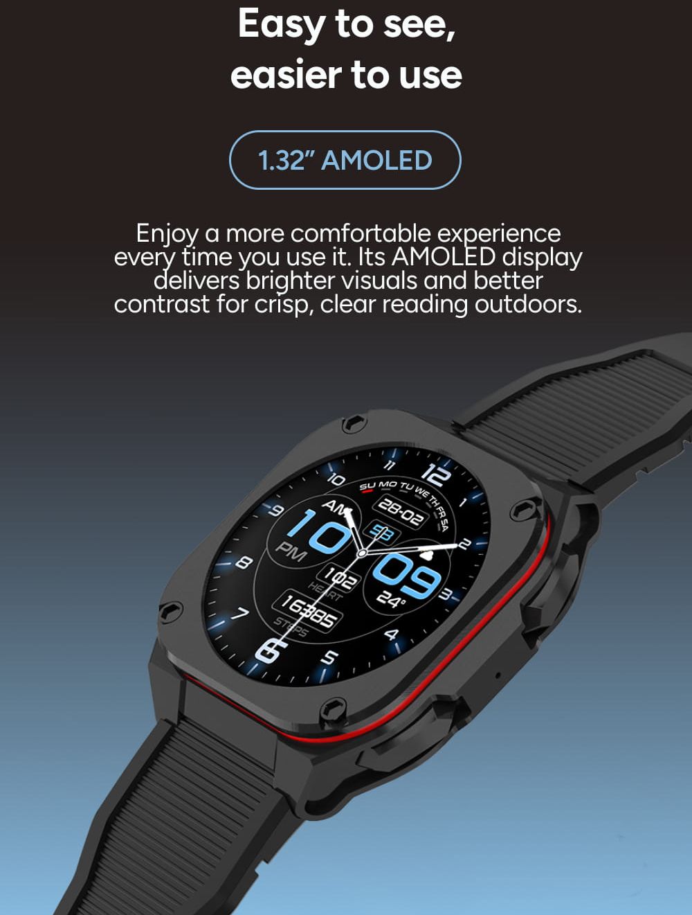 Užijte si dokonalý vizuální zážitek při každém pohledu na zápěstí. Špičkový 1,32" AMOLED displej přináší syté barvy a hluboký kontrast, díky čemuž je veškerý obsah perfektně čitelný i na přímém slunci.