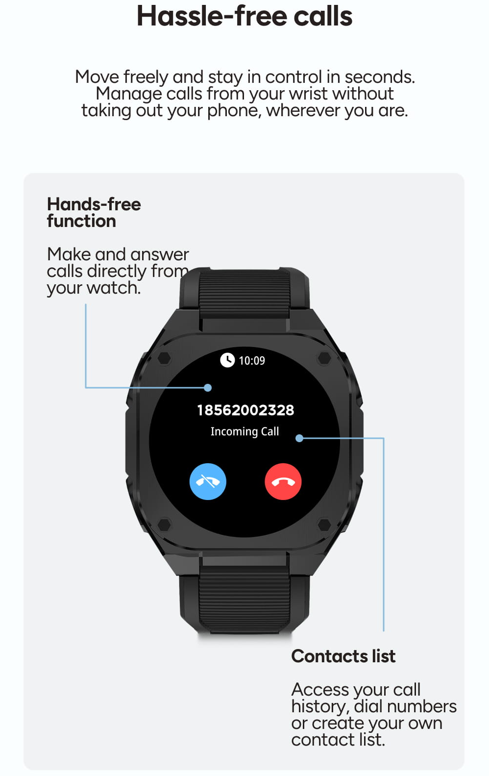 Mějte své blízké i kolegy neustále na dosah. Hodinky umožňují přístup k historii hovorů, vytáčení čísel a vytvoření vlastního seznamu kontaktů, což zajišťuje maximální kontrolu během pár sekund.