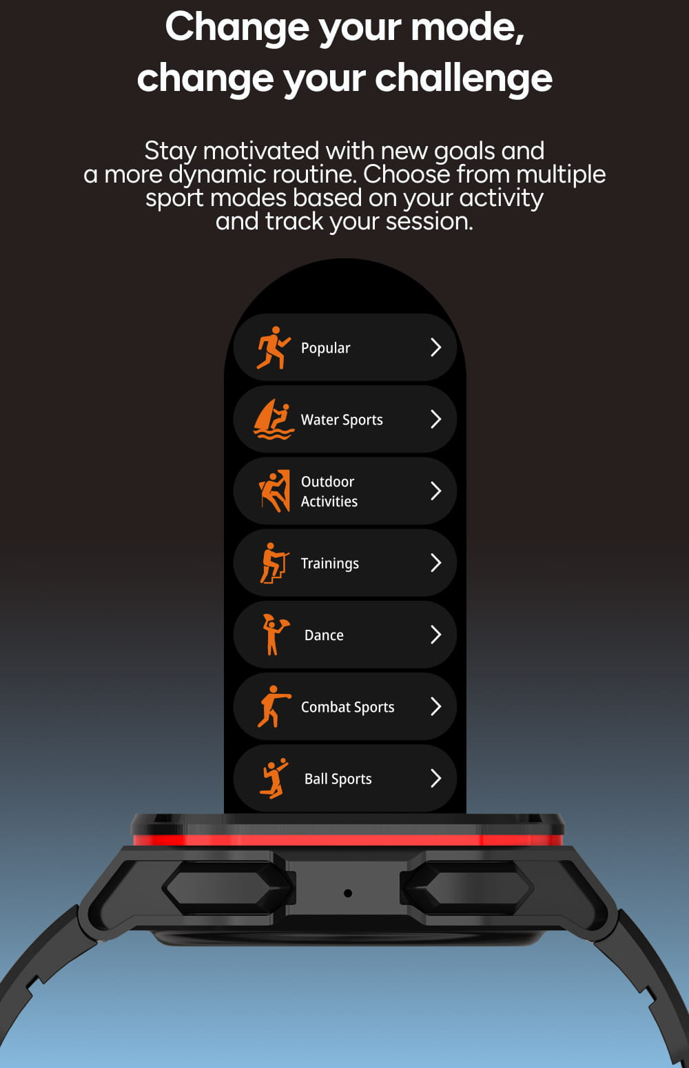 Ať už se věnujete čemukoliv, hodinky se vám přizpůsobí. Můžete si vybrat z mnoha kategorií, jako jsou vodní sporty, outdoorové aktivity, tanec nebo bojové sporty, čímž zajistíte relevantní data pro každou disciplínu.