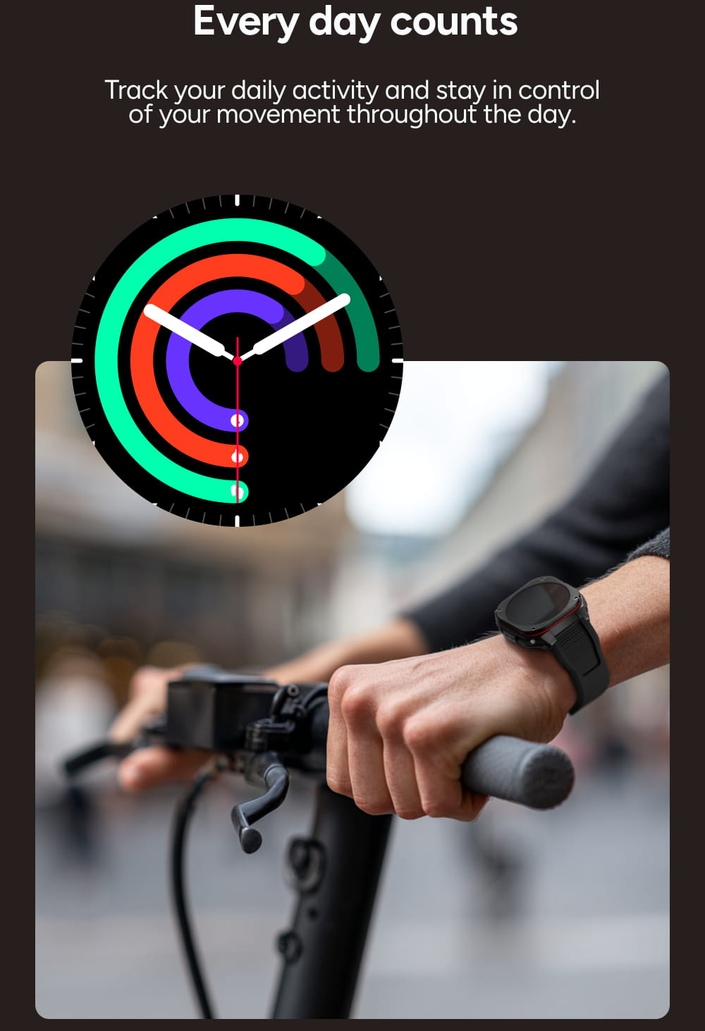 Zůstaňte motivovaní a sledujte, jak se vaše úsilí sčítá v každé minutě. Intuitivní zobrazení vám umožní bleskově zkontrolovat úroveň pohybu, ať už zrovna jedete na koloběžce nebo sportujete. Každý pohyb je důležitý a hodinky vám poskytnou přesná data pro překonávání limitů.