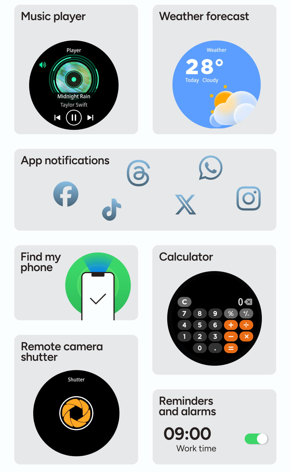 Mějte dokonalý přehled díky notifikacím z aplikací, předpovědi počasí a praktické kalkulačce. Hodinky vám umožní pohodlně ovládat hudební přehrávač nebo dálkově spouštět fotoaparát vašeho telefonu. Se Zenthium nezmeškáte žádnou důležitou zprávu ani naplánovanou událost.