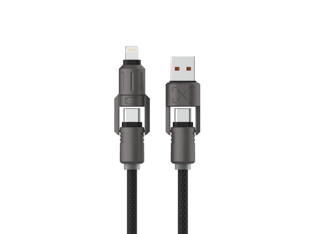Užijte si kabel, který se přizpůsobí každé situaci. Systém 4 v 1 umožňuje, aby jeden konec fungoval jako USB-A nebo USB-C, zatímco druhý může být USB-C nebo Lightning. Stačí konektory rozložit, přepnout a můžete je používat. Nabíjejte chytré telefony Android®, iPhony®, sluchátka, tablety i notebooky, aniž byste museli nosit více kabelů při cestování nebo venku.