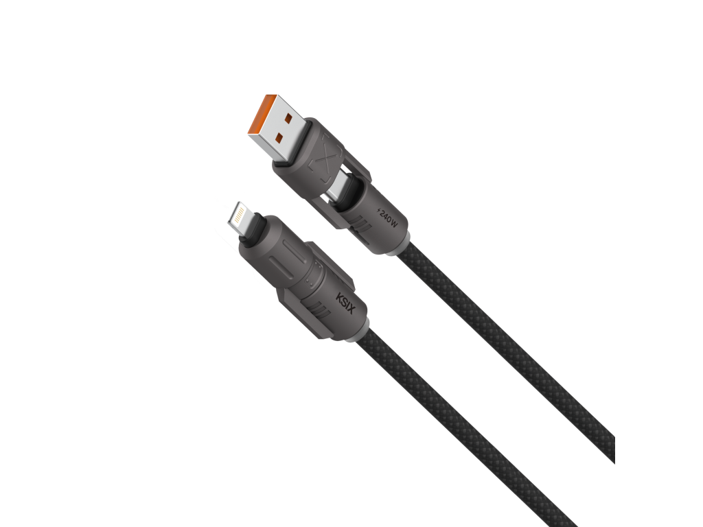 Kabel KSIX 240 W je navržen tak, aby vám usnadnil život a spojil v sobě všestrannost, výkon a odolnost. Díky skládacím konektorům jej můžete používat se všemi typy zařízení – od chytrých telefonů Android® a iPhone® až po notebooky. Výkon 240 W zajišťuje mimořádně rychlé nabíjení, zatímco inteligentní čip a opletené provedení garantují bezpečnost, odolnost a stabilní přenos dat.