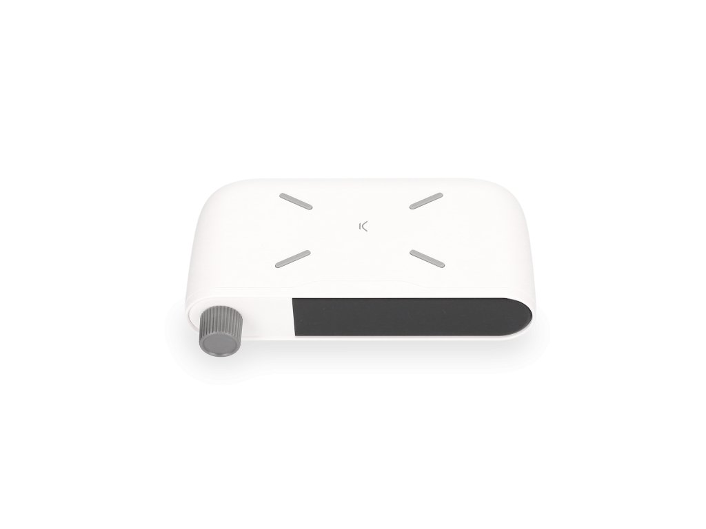 Na první pohled je jasné, co tento budík nabízí. Multifunkční kolečko slouží k nastavení času i budíku, displej zobrazuje aktuální čas a teplotu a horní část slouží jako bezdrátová nabíječka s výkonem 10 W. Každý prvek má své místo i účel – bez zbytečností.