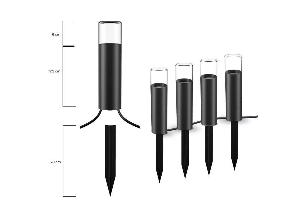V balení najdete 4 venkovní světla s výkonem 12 W a světelným tokem 200 lumenů. Díky zapichovacím hrotům je instalace rychlá a jednoduchá. Světla jsou navíc rozšiřitelná, takže si celou sestavu můžete kdykoli doplnit.