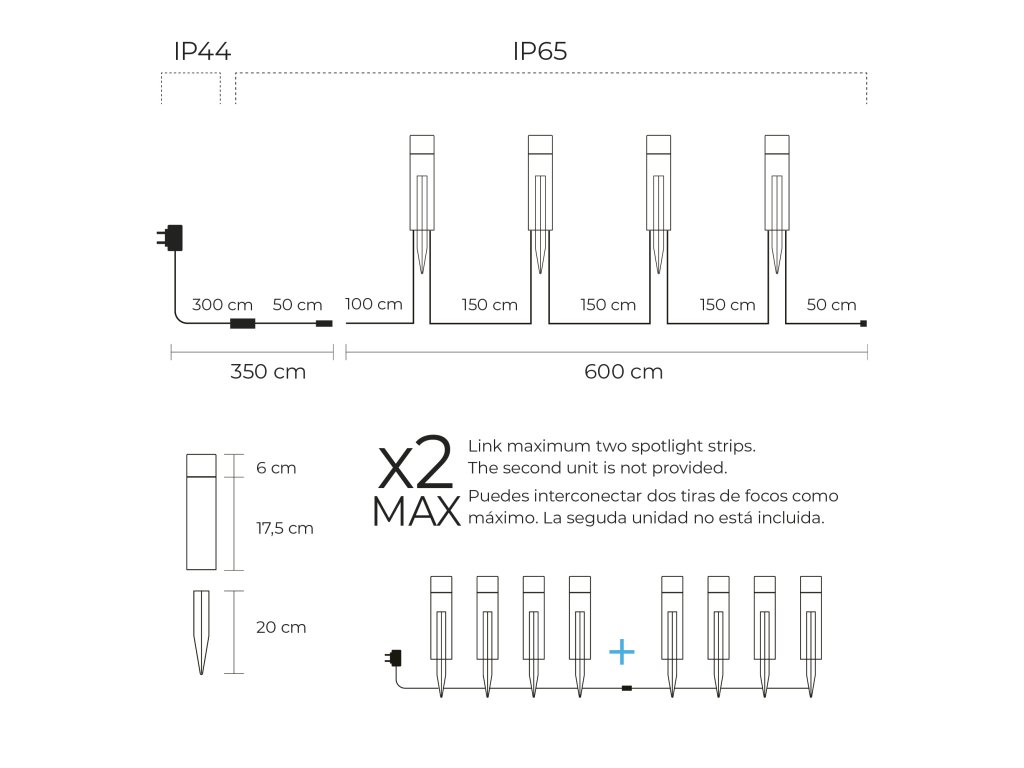Napájecí část splňuje normu IP44, což znamená ochranu proti stříkající vodě – ideální například pro krytý exteriér. Samotná světla pak disponují plným krytím IP65, takže jsou odolná vůči dešti, prachu i vlhkosti. Systém je tak vhodný pro dlouhodobé venkovní použití bez ohledu na počasí.