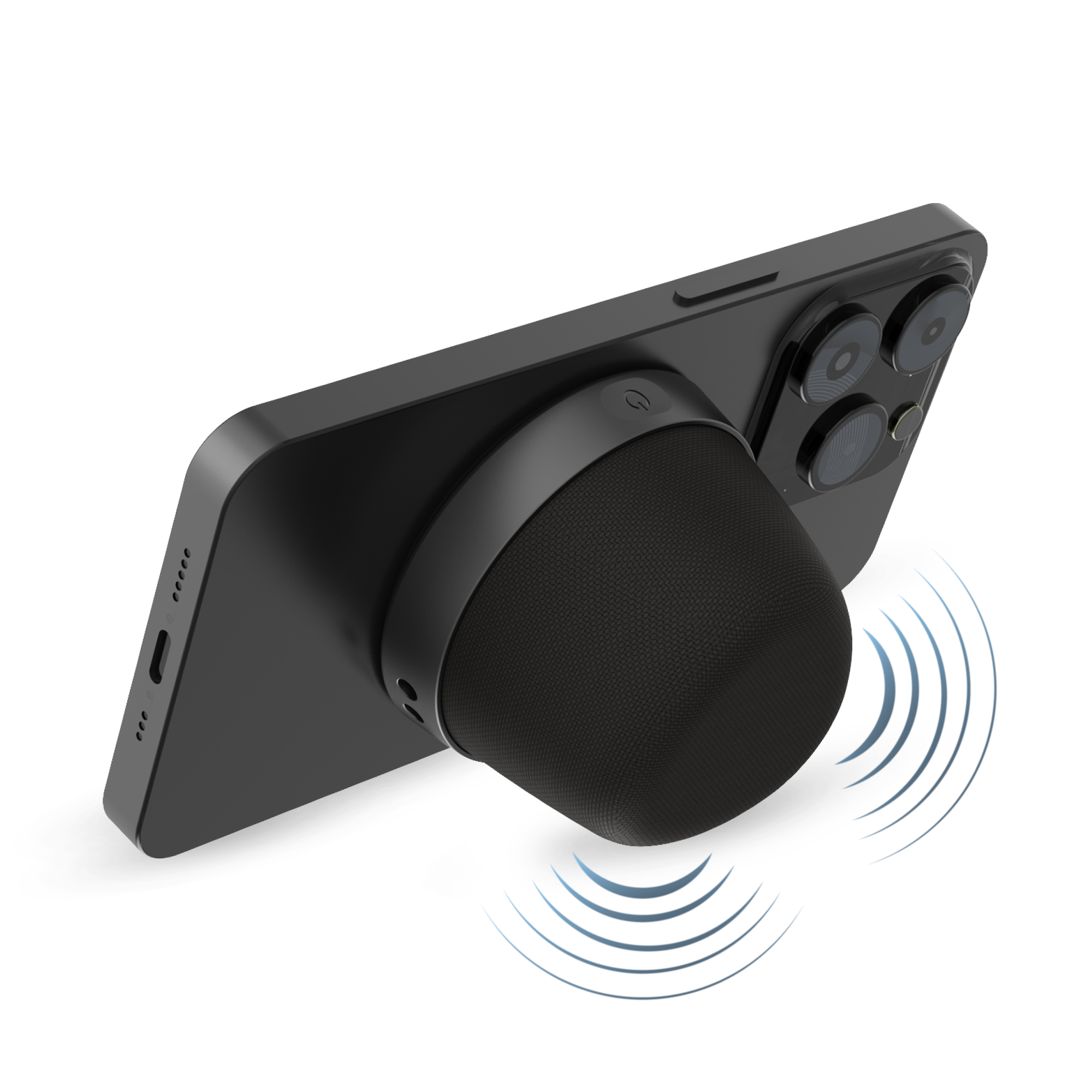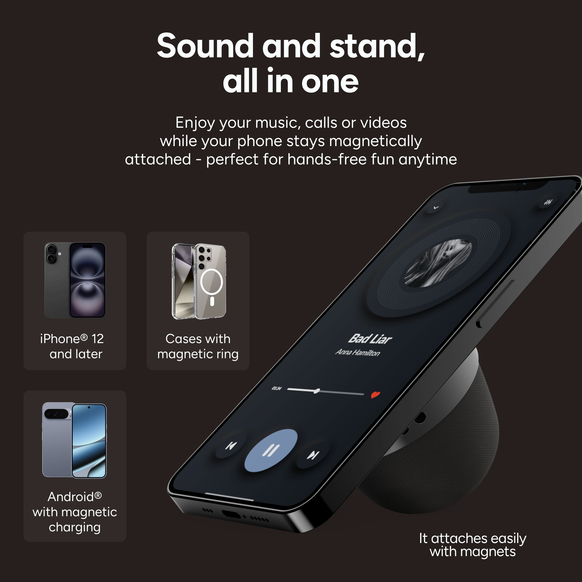 Reproduktor kombinuje funkci bezdrátového přehrávání zvuku a stabilního stojánku pro telefon. Telefon zůstává magneticky uchycený ve vhodném úhlu. Řešení je ideální pro sledování videí, poslech hudby i hands-free použití.