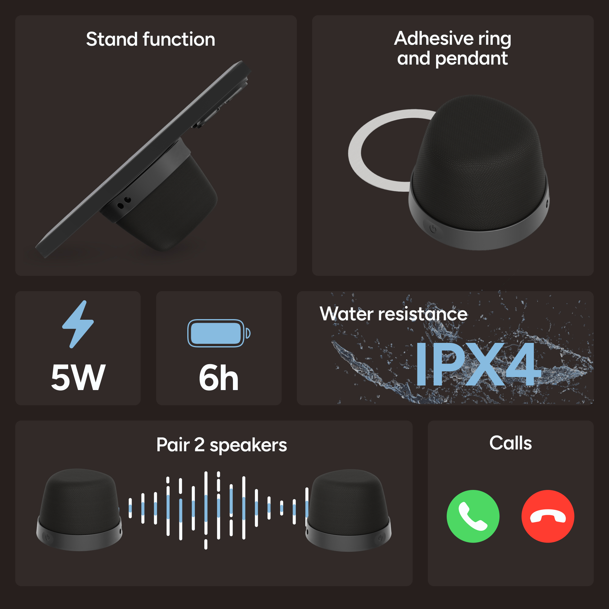 Díky certifikaci IPX4 je reproduktor odolný vůči stříkající vodě. Bez obav jej lze používat doma, venku i při aktivním pohybu. Konstrukce umožňuje také použití jako stojánek pro telefon při sledování obsahu.