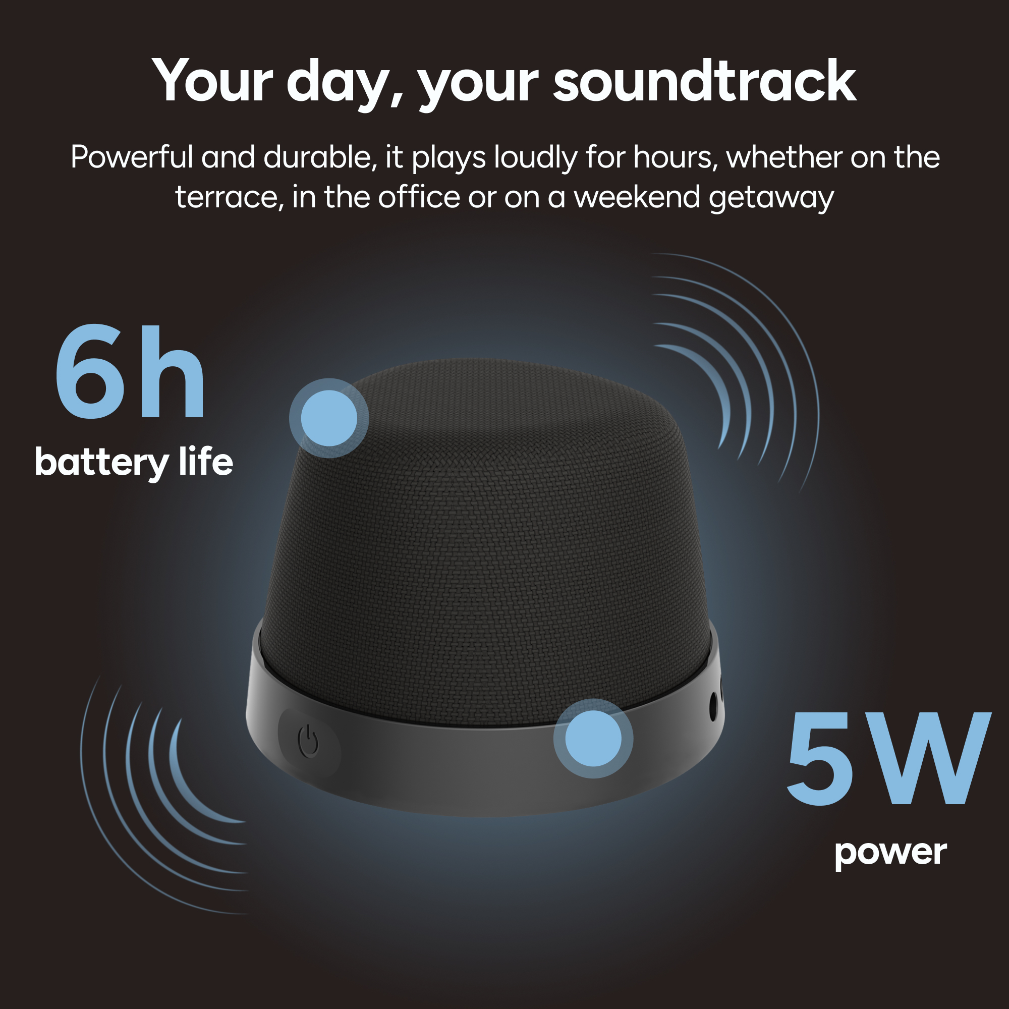 Vestavěná baterie poskytuje až 6 hodin nepřetržitého přehrávání na jedno nabití. Reproduktor je tak vhodný pro celodenní poslech při práci, odpočinku nebo cestování. Bez problémů zvládne hudební doprovod na terase, v kanceláři i během víkendového výletu.