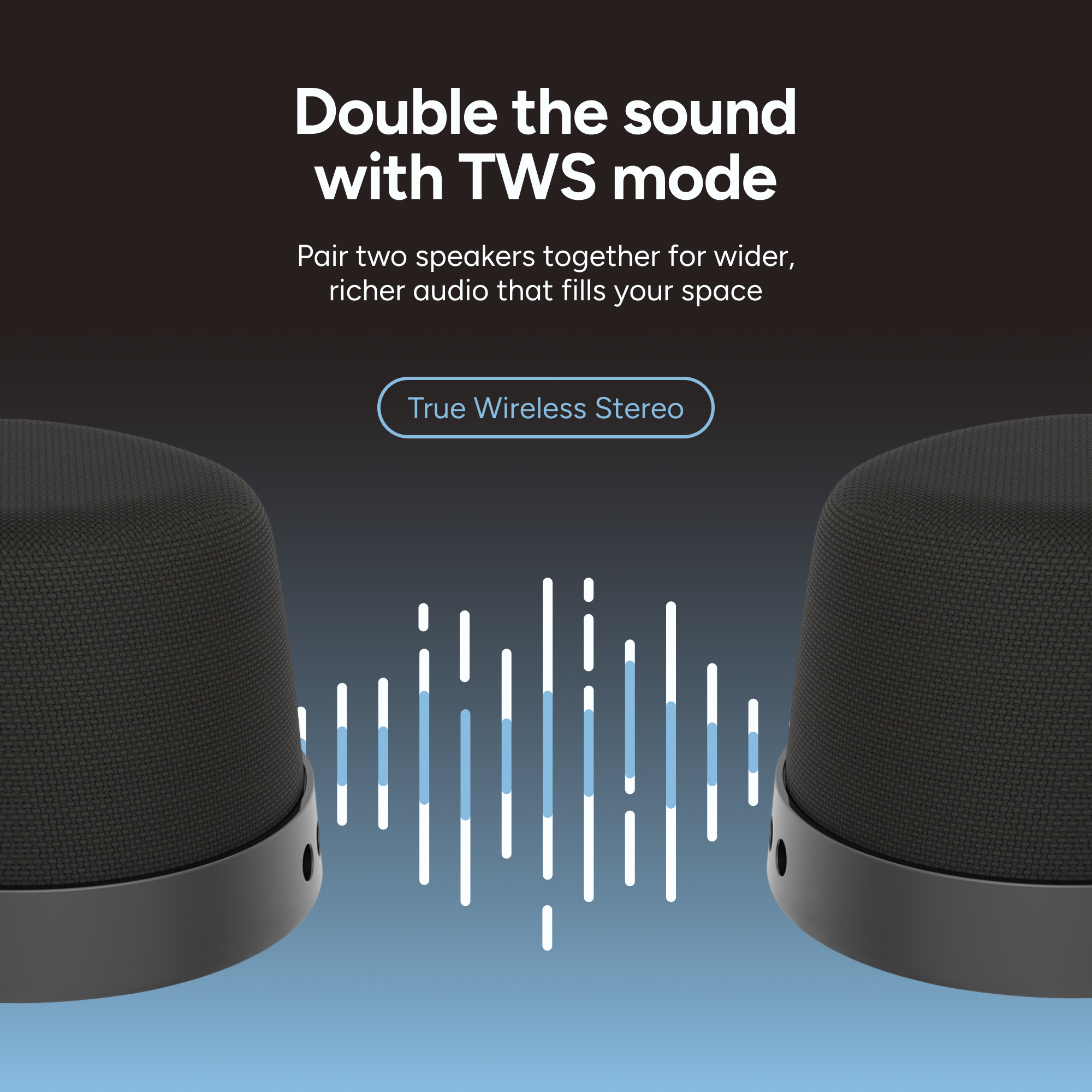 Reproduktor podporuje technologii TWS (True Wireless Stereo), která umožňuje bezdrátové propojení dvou reproduktorů. Zvuk se rozdělí na levý a pravý kanál. Výsledkem je skutečný stereo poslech bez kabelů.