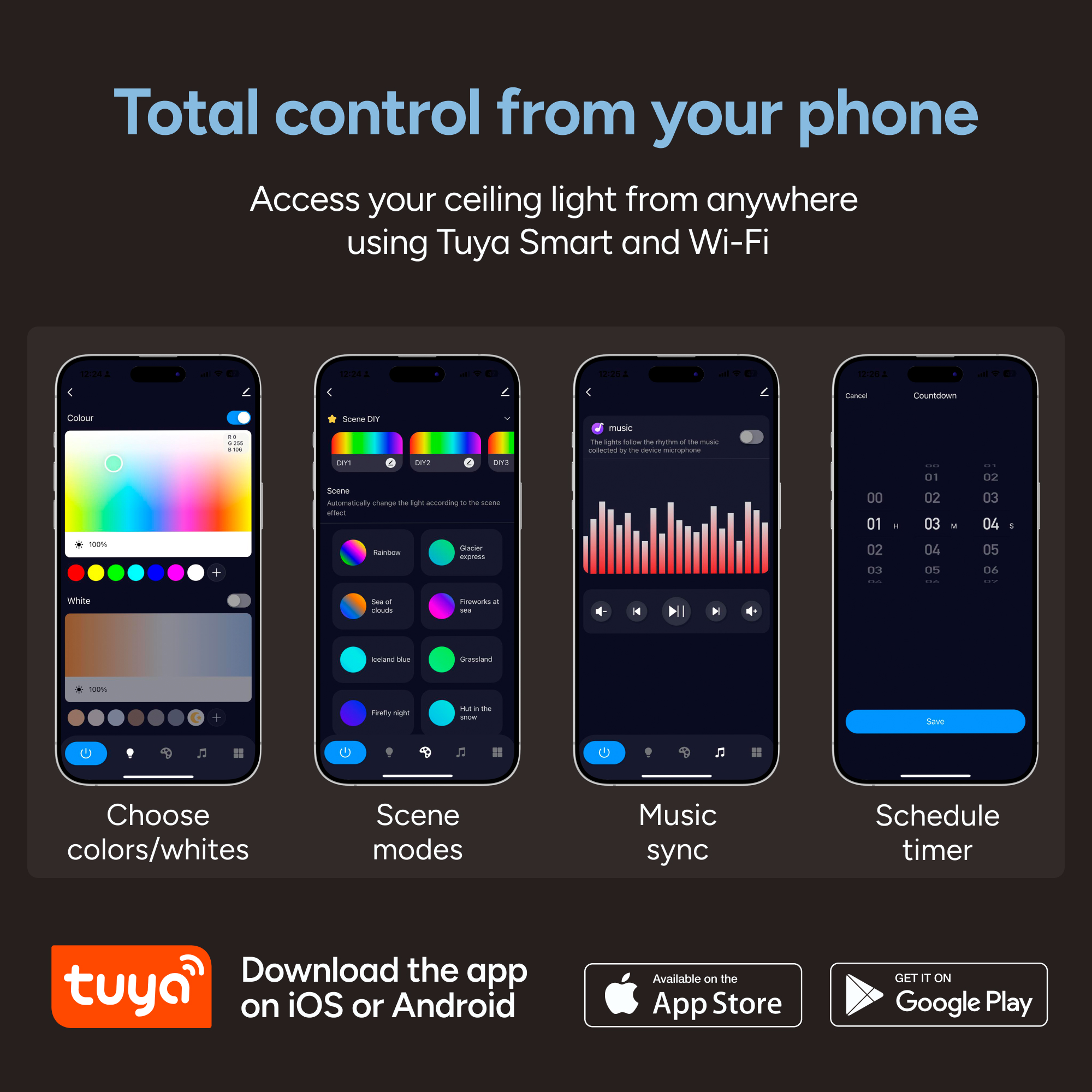 Aplikace Tuya Smart sdružuje čtyři hlavní nástroje: nastavení barev a teploty bílé, výběr přednastavených scén, synchronizaci světla s hudbou a časovač. Vše funguje přes Wi-Fi, takže máte přístup k ovládání odkudkoliv.