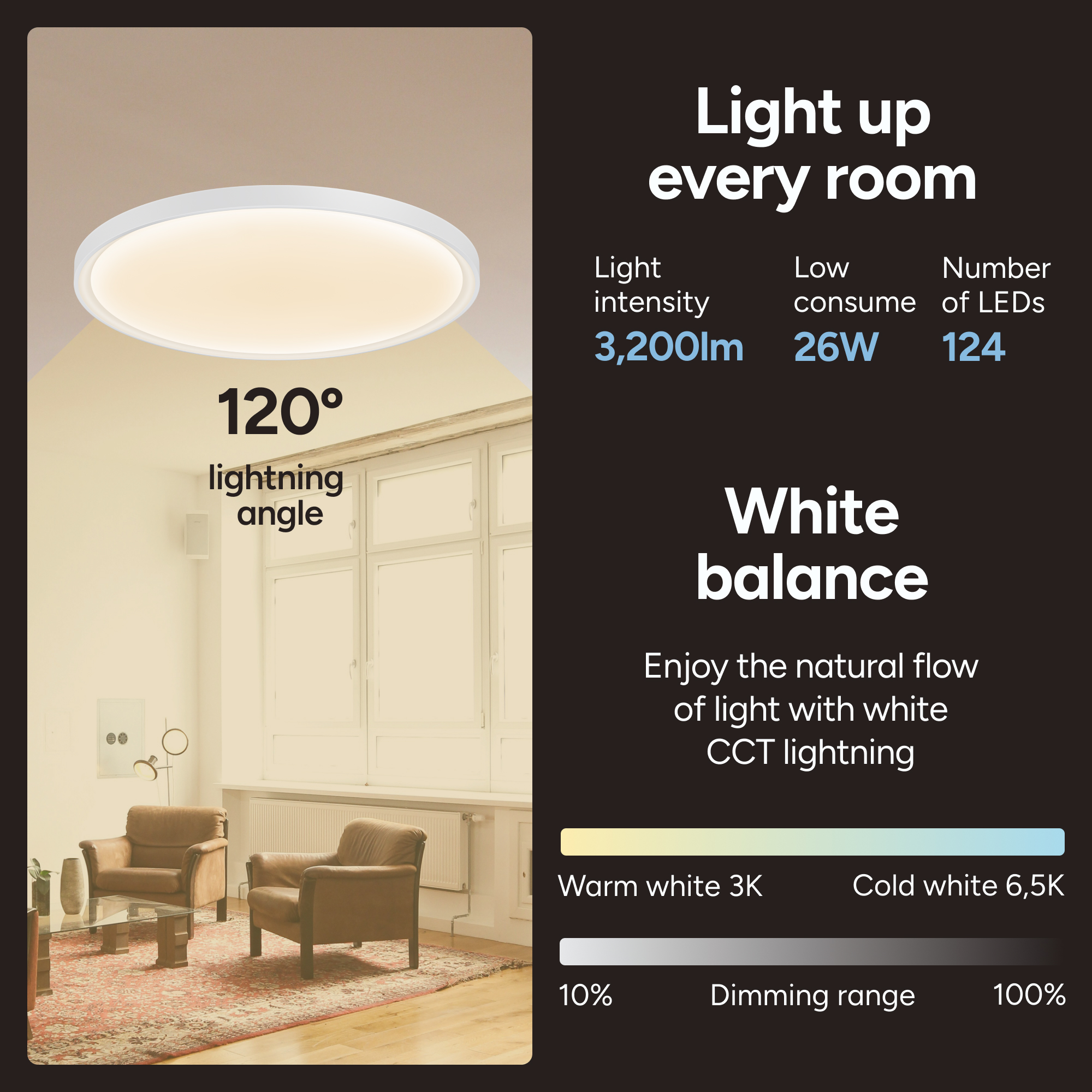 S výkonem 26 W a vysokou svítivostí 3 200 lm je toto světlo navrženo pro místnosti o velikosti 10 až 15 m². Zajistí dostatek jasu pro práci i běžný provoz domácnosti.
