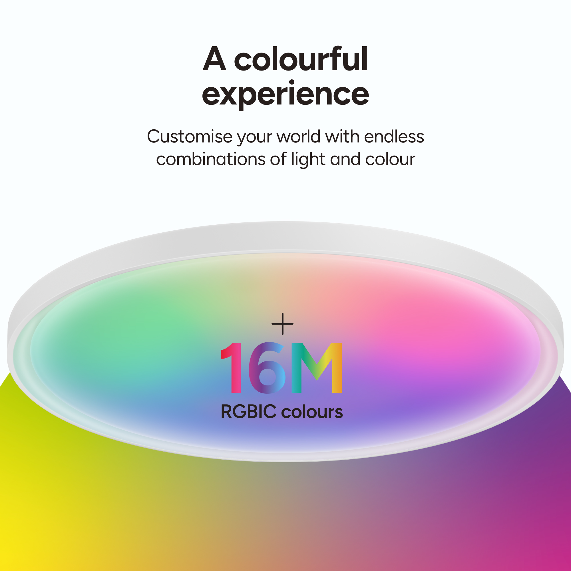 Pod minimalistickým krytem se skrývá RGBIC technologie, která umožňuje míchání více barev najednou. Svítidlo s průměrem 37 cm kombinuje moderní vzhled s praktičností a nabízí dostatečný výkon 26W pro osvětlení běžné místnosti.