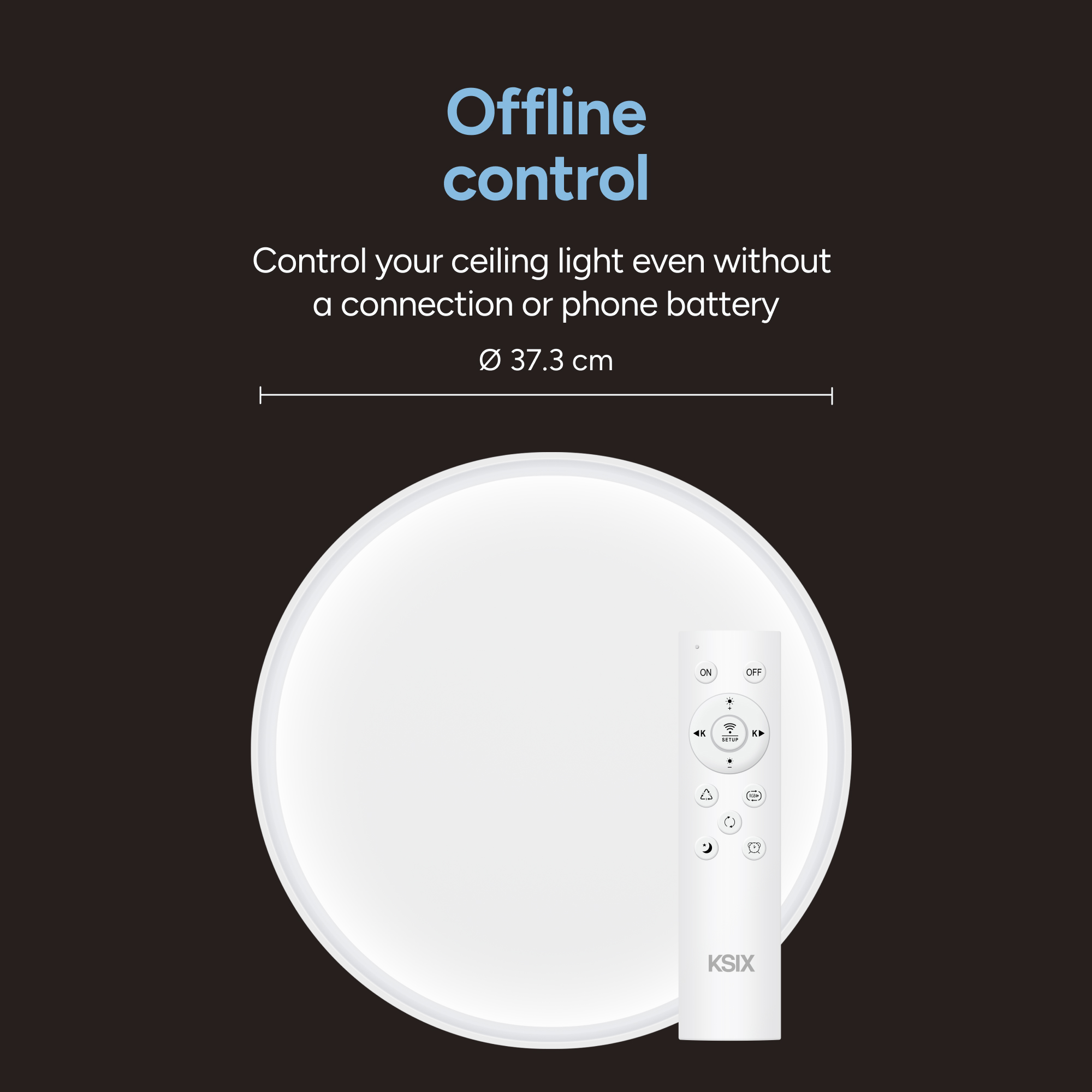 Stropní svítidlo KSIX Halo 2 o průměru 37 cm a výkonu 3 200 lm (26 W) využívá pokročilou technologii RGBIC pro míchání barev a dynamické efekty. Teplotu hlavní bílé barvy můžete plynule měnit v rozsahu 3 000 K – 6 500 K, takže světlo poslouží stejně dobře při práci i relaxaci. Vše pohodlně nastavíte přes aplikaci Tuya, která je kompletně v češtině, pomocí hlasových asistentů nebo dálkovým ovladačem. Navíc získáváte záruku 3 roky bez řečí a kompromisů.